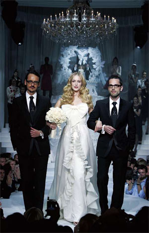 Eva 和Tony的结婚戒指,是属于Piaget的Possession钻戒,并用法文刻上了彼此刻骨铭心的爱语。新娘子镶有80颗钻石,18K白金的钻戒价值25000美元。除了结婚戒指,Tony 还收到了Eva 赠送价值45000 美元的Piaget腕表,腕表上镶有9 颗钻石(代表Tony 在马刺队的球衣号)。Viktor & Rolf为H&M设计的婚纱,售价为349美元-比起动辄几千美金的名师婚纱设计,Viktor&Rolf设计的婚纱引来抢购风潮,原因很简单,一是因为这对双子设计师实在太有名,另外因为它的价格——售价仅349美元。在国外,很多设计师在婚纱上做文章,将新娘婚纱玩出了花样。今年三月,在伦敦举行的《新娘靠边闪》名人服装拍卖展上,前英国小姐达尼丽。