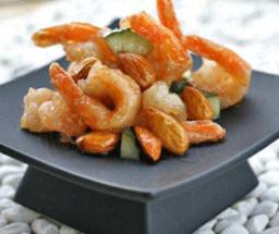 原料:美国大杏仁40颗 虾500克 黄瓜1根 吉士粉1茶匙(5克) 清水50ml 盐1茶匙(5克) 料酒1茶匙(5ml) 玉米淀粉2汤匙(30克) 柠檬汁2汤匙(30ml) 清水100ml 白糖1汤匙(15克)