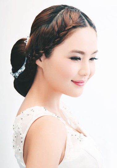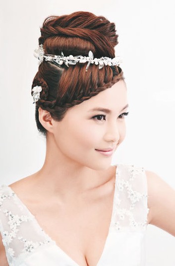 优雅发髻辫:结合了丸子头和蜈蚣辫两种打造手法。用精致的蜈蚣辫缠绕在丸子头顶端,打破传统高发髻的沉闷,最后利用精致的水晶发花点缀在耳际上方,亮点十足。
