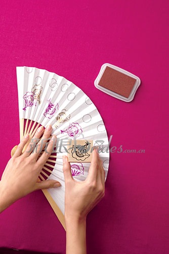 2、 用花形印章沾取粉色墨水,将扇面展平,小心地在扇骨处的纸面上均匀地印4朵粉色花朵,每朵花朵之间的距离要相等。将纸扇晾干,再反面重复上述步骤。将所有纸扇的正反两面都印上粉色花朵后,用热水和清洗剂把印章上的粉色墨水洗去。