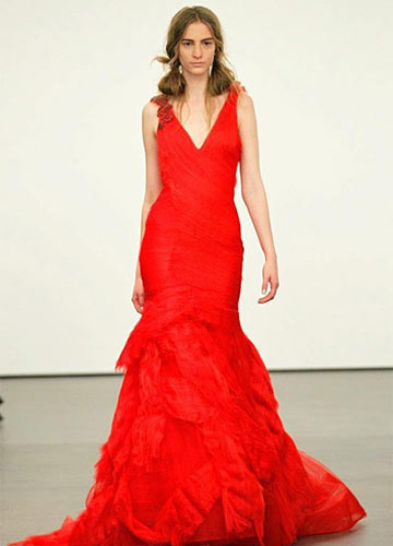 先不说纽约婚纱周,光是说起婚纱,我们自然是不会忘记Vera Wang的设计,在2013春夏新款设计中,伸展台上出现了大量深浅不一的红色婚纱系列,无论是石榴红、大红、暗红、红褐色,还是紫红色,全部贯彻着Vera Wang的浪漫柔美,在柔软的薄纱中,立体的花朵中,还有鱼尾式的摆尾,简直是每个女生心目中的完美款式,不同于白色,这种带着中国红的气势,可谓是更加能调动人们的情绪呢!
