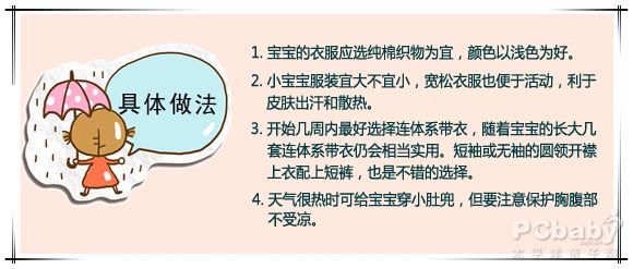 宝宝的皮肤十分的娇嫩,适应环境的能力差,很多妈妈们担心宝宝容易患上呼吸道疾病和胃肠道方面的疾病,在给宝宝穿衣服时,坚持“宜多不宜少”的原则,生怕宝宝着凉。其实,在炎热季节,宝宝穿合适的衣服就行了,要帮助宝宝有效的出汗,这是让宝宝感到凉爽的有效办法之一。