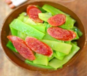 5:下入莴笋和香肠同炒。