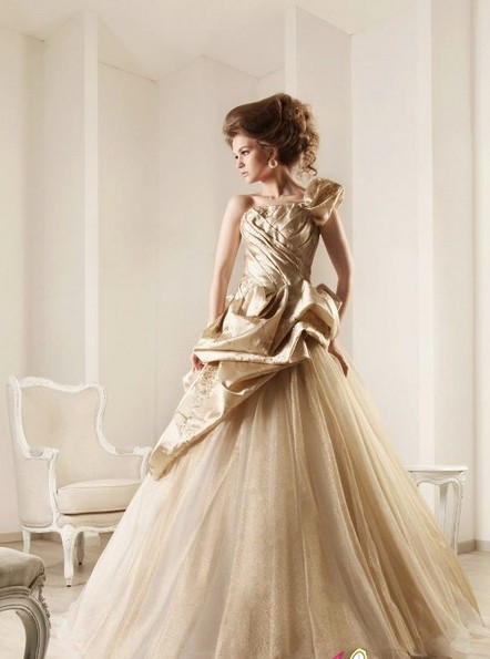 金色的优雅婚纱设计,立体的时尚皱褶感让人为之心动,金色的公主型婚纱裙摆展现了女王般的魅力。