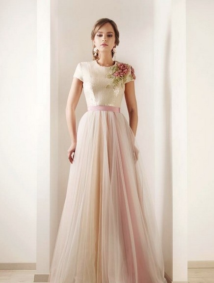 设计简约的短袖婚纱,仅用肩部粉色的立体花朵装饰你的造型魅力,拼色的百褶裙摆加上高腰的设计是显高装扮的法则之一。