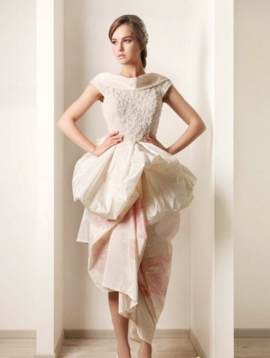 独特设计的婚纱,呈现花苞的裙摆是最近流行的款式。胸前皱褶的处理轻松让你的胸部更显丰满。