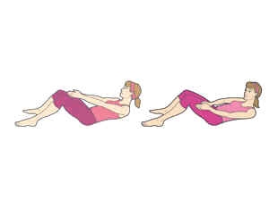三、仰卧卷腹。1.仰卧,双膝卷曲,脚部平放于地面。收缩腹肌,抬高上身的同时伸直双臂,双手合十,指向腿的中部。2.向左侧移动,再回到中点,然后向右侧移动,再回到中点。动作重复30秒,休息片刻后,再做30秒。