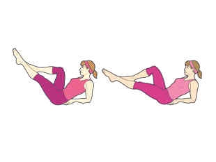 四、仰卧举腿。1.平躺后,双肘背后撑地。双手置于臀部下。弯曲右膝,伸直左膝的同时,腿部上举。身体形成一个V字。2.右膝弯曲,双腿降低几英寸,然后再上举。幅度越大,挑战越大。动作缓慢进行,30秒内尽量多重复,然后弯曲左膝,伸直右腿,重复相同动作。