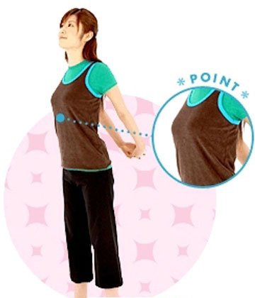 2、右脚往右踏出一小步,令双脚之间的步幅拉开至与肩宽同宽,双臂往后伸展,手掌向上,左右手指互握,慢慢向上提拉双臂,令胸廓进一步外扩,头随之仰起吸气,保持姿势3秒。