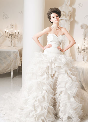 婚纱依旧是公主梦的最好诠释,左边的款式是特殊上身的卡肩设计,突显的是小公主的气质,全手工打造的珍珠图案。在缝制细节上拒绝了呆板,虽然花纹繁复,但素雅统一的色调能让新娘呈现出清新的样貌;右边的裹胸婚纱,我们为了制造出若隐若现朦胧感的浪漫,胸口用了与裙摆同样材质的不规则软纱装饰,金色刺绣图案很是细腻,我希望在尽可能呈现夏日新娘清爽感的同时,我的奢华小细节看起来更加低调。