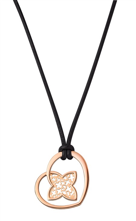 18K玫瑰金心形吊坠上刻印有柔美的"I Love You"字样。而吊坠内部则可为您刻上只属于自己的专属浪漫信息,吊坠的曼妙设计和玫瑰色耀目光芒仿佛庇护着这一爱的宣言,燃起心中温暖的回忆。