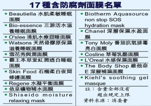 消委会宣传及社区关系小组副主席许树源说,这5种常见的对羟基苯甲酸酯类防腐剂,毒性不高,故广泛用于化妆品,防止微生物滋生。不过他说,对此类防腐剂过敏人士,应特别留意面膜卷标有否列明含对羟基苯甲酸酯,因长期使用或会引致接触性皮肤炎。
