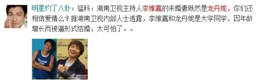 日前,有网友在微博爆料,称湖南卫视快乐大本营主持李维嘉即将结婚,而结婚对象竟然是前湖南卫视高层龙丹妮。