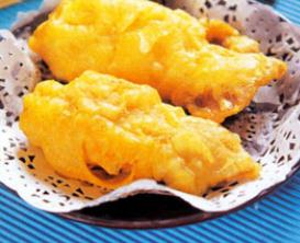 3、坐锅点火放入油,油热倒入鱿鱼,炸至变色捞出沥干油,再放入锅中炸至金黄色捞出摆入盘中即可。