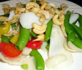 3、锅里放入油,倒入彩椒、生姜、甜豆翻炒片刻,加入墨鱼片,加盐、鸡粉炒半分钟,用淀粉水勾芡。最后倒入腰果翻匀起锅。