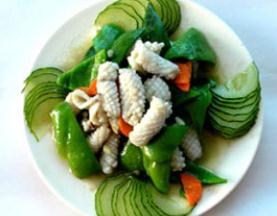 8. 锅留余油,先将蒜米、葱白下锅,泡一下,再入切好的花菇、冬笋、青椒、胡萝卜翻颠几下,依次加入骨汤25毫升、调味品、湿淀粉(勾薄芡)、过油的墨鱼卷,炒几下,即成。