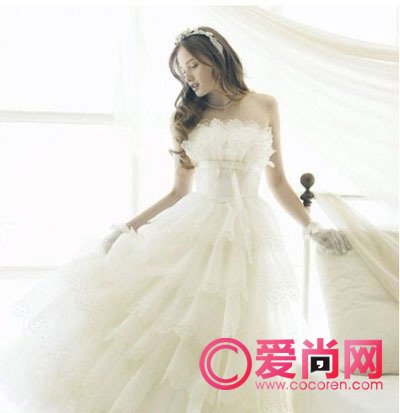 高腰的设计将新娘整个人的身材比例拉高,层层叠叠的婚纱裙摆增加了婚纱的层次感,营造出朦朦胧胧的美丽,贝壳抹胸上的蕾丝花边让新娘更添娇俏动人。