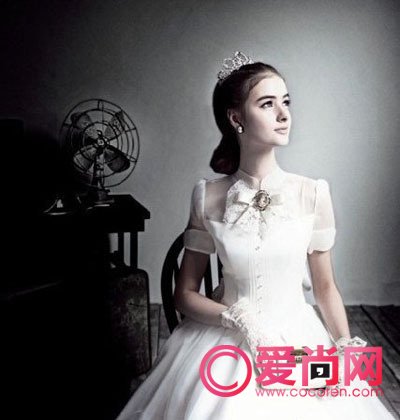 小竖领和特别的肩部设计,蕾丝手套、珍珠耳环、胸前的金属扣下的蝴蝶结,以及新娘头上的水晶皇冠,无不让这款婚纱充满了复古的端庄和高贵之感,新娘如同从上个世纪里穿越而来的名媛淑女,那么的圣洁高贵而动人。