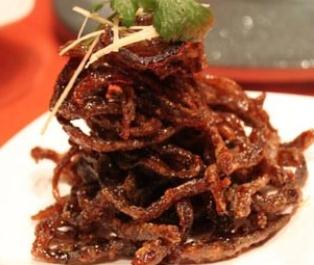 2.锅置旺火上烧热,加入豆油,烧至油温约200℃时,放入鳝肉,炸约3分钟捞出,待油温复升至200℃时,复放鳝肉,炸约4 分钟,再用小火炸脆;另取炒锅置旺火上烧热,舀入豆油25 克,加葱、姜末煸香,加黄酒、酱油、白糖烧沸成卤汁,即捞起炸脆的鳝肉,放入卤汁内颠翻,淋麻袖出锅装入盘内,成宝塔形,上用姜丝作点缀即成。此菜形态美观,色呈酱褐色,鳝肉松脆香酥,卤汁甜中带咸。