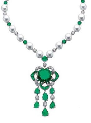 Bulgari 顶级珠宝系列白金镶嵌祖母绿珍珠和钻石项链