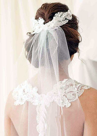 选择几乎透明的披挂式头纱或唯美的轻飘长头纱,可以露出公主新娘迷人的脖颈和柔滑的肩线,与轻纱质地的裙摆相呼应,为宾客带来强大的浪漫梦幻色彩!