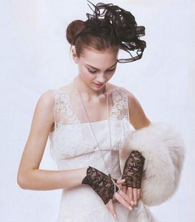 蕾丝边的肩带,蕾丝款的黑色手套,都为纯白的婚纱增添着浪漫的气息,充满个性的设计让你的婚礼显得与众不同!