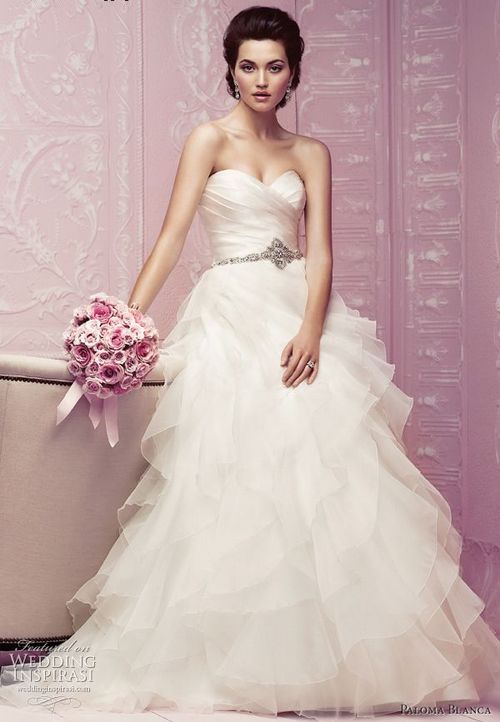 柔软的层叠薄纱质感十足,齐地的裙摆适合身材娇小的新娘。