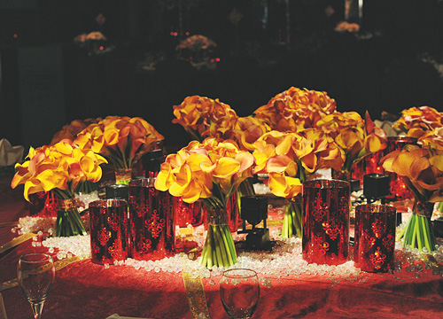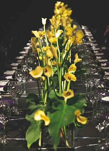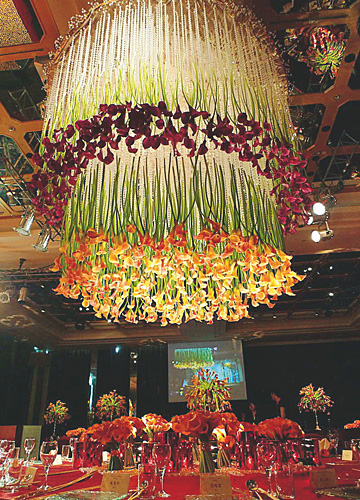 马蹄莲在当代被应用到婚礼中来,最初是在地中海沿岸以及南非等国家,人们用它来编织新娘手中的花束,当身着抹胸婚纱的新娘将花束轻揽在胸前,长长的花茎所勾勒出的优雅弧线,与花朵映衬香肩的新娘相得益彰。仔细想来,很少有人将马蹄莲大量用在婚礼花艺设计中,或许一是因为马蹄莲的根茎过于柔软,难以造型。另一原因则是马蹄莲本身所散发出的孤傲气质,很难与其他花卉相搭配。但她的清丽脱俗,实在难以让人抗拒她的魅力。因此,我尝试使用马蹄莲来做婚礼整体设计,在不断的努力下,终于成功地使用大量马蹄莲打造了一场“烟花巴洛克”婚礼,马蹄莲的“佛焰苞”因形似佛主座前的烛台而得名,外形恰似燃烧的火焰,由她独特的外观与绚烂的色彩来模拟烟花绽放的情境最是恰当不过。