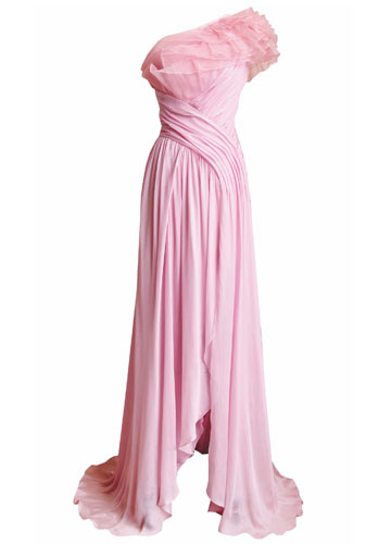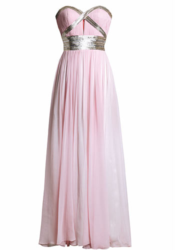 2. 淡粉色系礼服裙也分冷暖色调,肤色偏黄的伴娘,最好选用偏白的冷调粉红色,并用闪亮水晶元素来映衬自己的肤色。