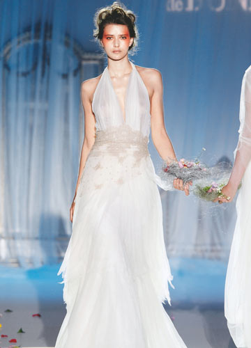 深V设计与鱼尾裙摆勾勒性感身形,立体花朵点缀增加精致细节看点,收紧的宽版腰带勾勒出身材的黄金比例。朦胧而高贵的新娘形象立显。