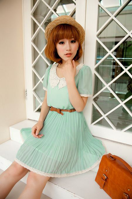 娃娃领连衣裙,假腰带设计,很清新的颜色和款式哦