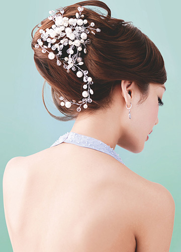 简单的盘发当然不能满足既清爽还要很性感的需求。梳一个高高的发髻,将水晶发饰缠绕住发包,露出纤细的脖颈就是让整个发型线条明显略带性感的小心机。