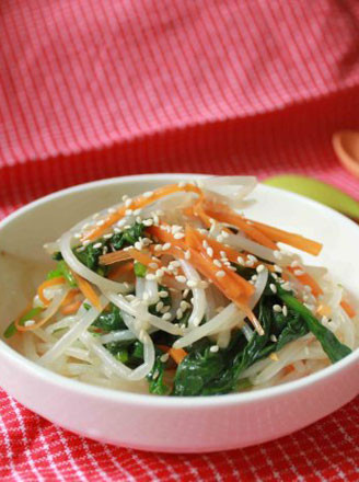 三、捞出菠菜挤干水分切段,与豆芽、胡萝卜一起装碗待用
