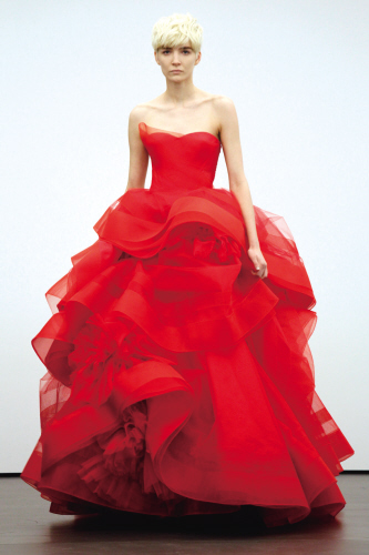 这款婚纱运用了中国婚礼最传统的颜色红色,它象征着繁荣、爱情和喜悦。层叠的雪纺与薄纱,确保了柔美的外观,同时匀称添加的装饰让人联想到红毯礼服的魅力。
