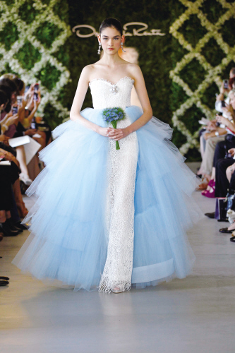 蓝色的婚纱是婚礼上罕见的色彩,淡蓝色的层叠薄纱裙多少有点悖逆的味道。