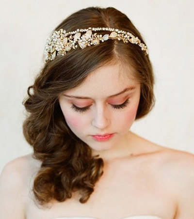 不规则的钻石镶嵌发箍搭配新娘大卷的长发,清新优雅。