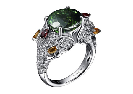 设计理念:圆形的碧玺镶在象形宝座上,雍容、华贵的气息铺面而来;而长方形的绿色碧玺和它的宝座搭配充满王者的霸气。