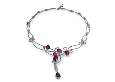 设计理念:婉约的藤蔓设计,如一个美丽的女子,妖娆、妩媚,红碧玺的点缀,则赋予产品以火红的热情,象征女子对爱情的向往,对生活的热爱。此款产品适于表达爱情的火热和缠绵,就像热恋中的男女,眼睛都会发出光来。