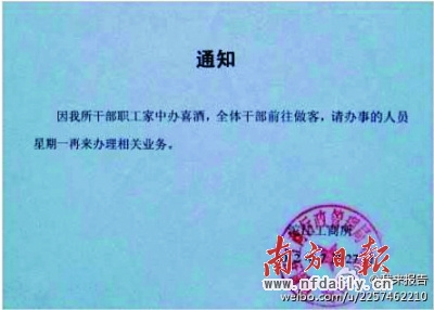 前日下午2时许,网民“老船大师傅”发布一条图片微博,内容为沱江工商所于2012年7月27日发布的通知,称“因我所干部职工家中办喜酒,全体干部前往做客,请办事的人员星期一再来办理相关业务”,落款处还加盖了凤凰县工商行政管理局沱江管理所公章。网民“老船大师傅”称其是“最实在的政府通知”。