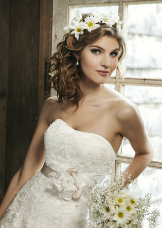 精致的蕾丝让丝缎的婚纱充满细腻的女人味;腰部独具匠心的层叠设计,通过纤细的腰部将胸线烘托得饱满;A型轮廓将体态娇小的新娘塑造得玲珑有致。