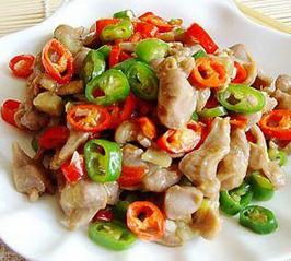 1、鸡胗去除筋膜洗净切片,加料酒、生抽、耗油、胡椒粉、干淀粉拌匀腌制30分钟。青红椒、泡椒切小圈,姜蒜切碎待用