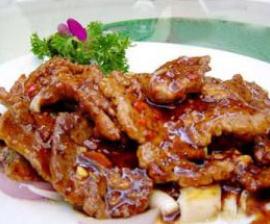 3)、炒锅内放入花生油,烧至六成热时,下入牛柳炸至金黄色,捞起,一件改切三片装盘即可。