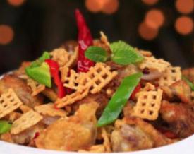 脆排骨、洋葱、红绿彩椒、红辣椒、花椒、小米锅巴。