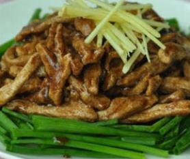 8、将葱丝摆在盘中,盛入肉丝,上面再放点姜丝即可。