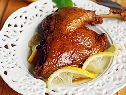 1、鸭腿洗净沥干水份,用盐,胡椒碎均匀抹在鸭腿上,柠檬切片和鸭腿拌匀,放冰箱冷藏腌制至少4小时(时间最好是12小时)