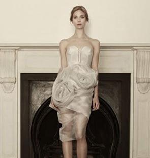 看似简约的抹胸短款婚纱上,用面料在腰间做出玫瑰造型,唯美得令人陶醉。裙身通透的质感还有着些许的性感味道。