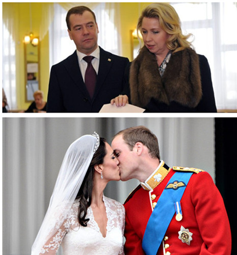 除了梅德韦杰夫夫妇,英国王子威廉和妻子凯特的终成眷属也被传为一大佳话。2001年,威廉王子在圣安德鲁斯大学与凯特相识。当凯特第一次出现在公众的视线中时,威廉王子拒绝承认他和凯特的恋情,但是媒体拍到她和威廉在一场橄榄球比赛中出双入对,亲密地谈话。