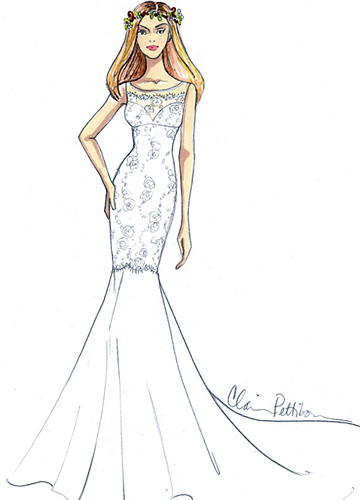 品牌克莱尔·佩蒂伯恩 (Claire Pettibone) 为JA设计的婚纱灵感则来于珍妮弗·安妮斯顿 (Jennifer Aniston) 邻家女孩的形象。设计师认为JA自然亲和的性格比较适合低调温馨的庭院婚礼,所以让JA穿上精致蕾丝和花卉图案刺绣的婚纱,戴上浪漫清新的花环并配合她飘逸自然的长发是最为适合的造型。