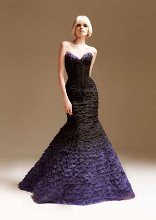 微微扬起的头,突显出如同女王一般的气势,稍稍倾斜的肩膀,一只手再前一只手在背后,显得气场十足,配上紫色渐变扇形图案的的大裙摆礼服,很有范儿。