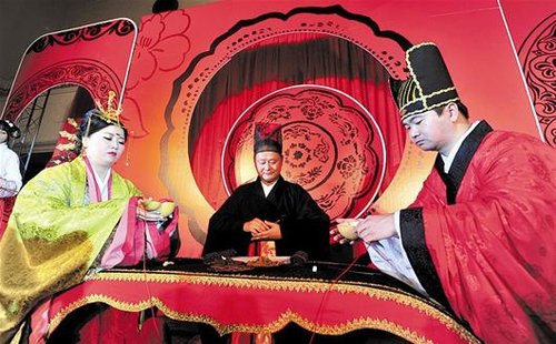 古代“男女自七岁坐不同席,食不共器”。既然要结为夫妇,两人便行同牢之礼,即坐下来在一个盘子里夹菜吃,再行合卺之礼。最后,解缨、结发,从此结为夫妇,新人向宾客作揖答谢。